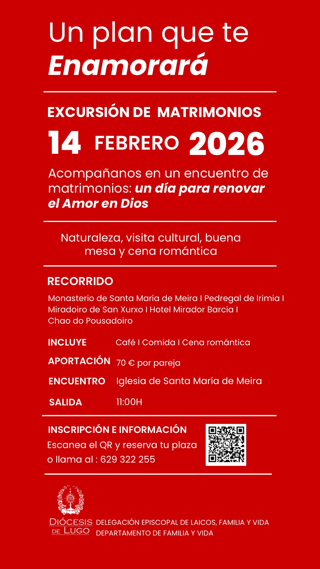 En la Semana del Matrimonio, la Diócesis de Lugo propone, a través del departamento de Familia y Vida, una sugerencia muy concreta para cuidar la vida en pareja: una excursión pensada para matrimonios que quieren parar un momento, reencontrarse y volver a poner lo importante en su sitio. No es un “plan ideal” para gente perfecta: es un día para matrimonios reales, con su historia, su ritmo y sus retos.