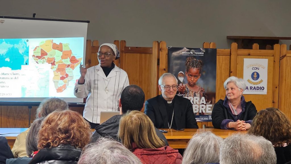 La parroquia de San Francisco Javier (Lugo) acogió un encuentro de sensibilización con Manos Unidas dentro de una tarde de convivencia y compromiso solidario. La jornada se articuló en tres momentos: el coloquio “Combatir el hambre para alcanzar la paz”, a cargo de Marie Claire Silatchom, misionera dominica del Rosario; la Eucaristía, presidida por el Obispo de Lugo, Mons. Alfonso Carrasco; y, una cena solidaria en el salón parroquial.