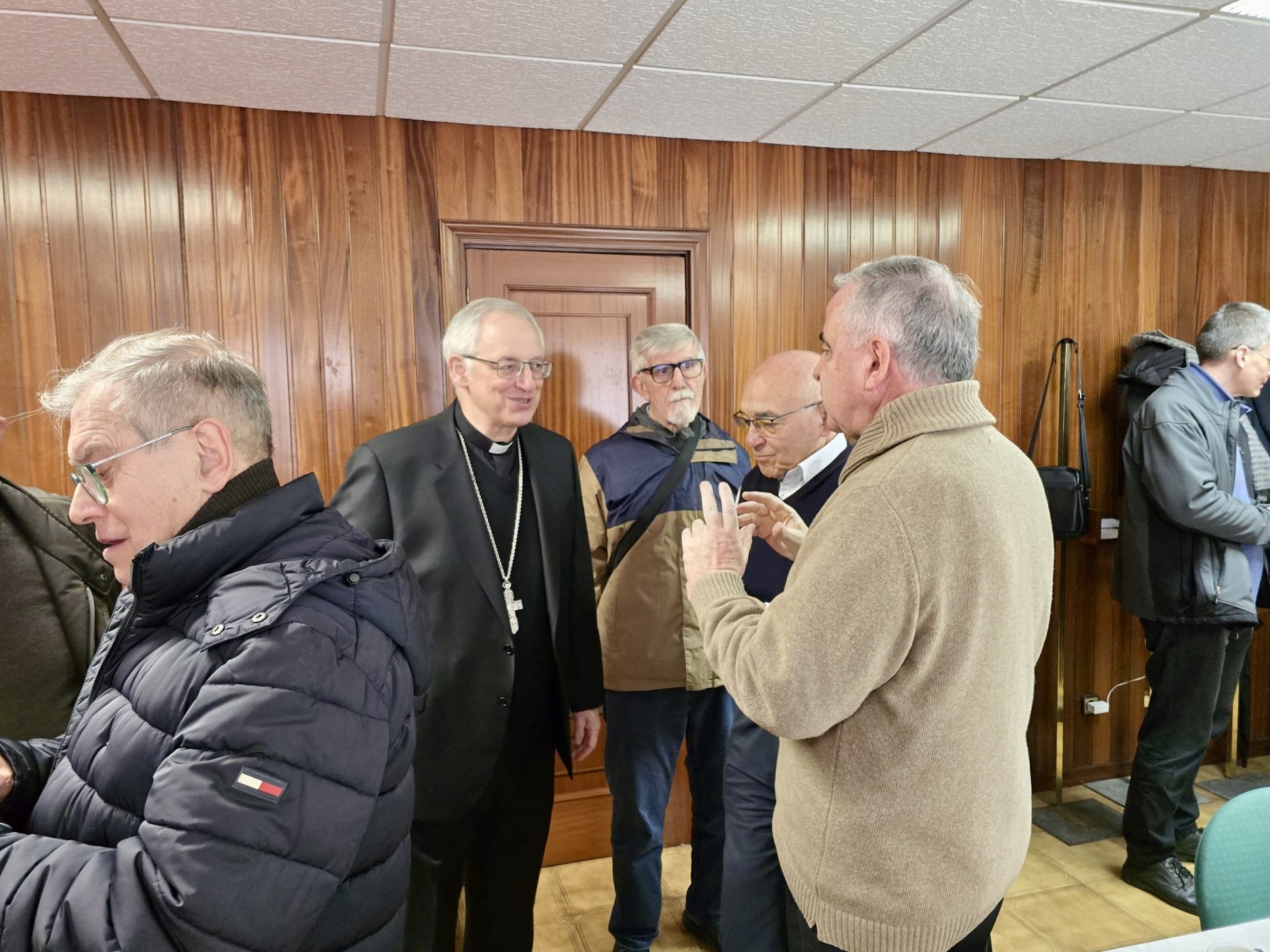 El retiro continuó con una charla–coloquio de 13:00 a 13:30 h. En ella, el Obispo de Lugo, en su condición de presidente de la Comisión para la Educación y la Cultura, abordó diversas cuestiones relacionadas con el ámbito educativo, ofreciendo claves de discernimiento pastoral y diálogo.